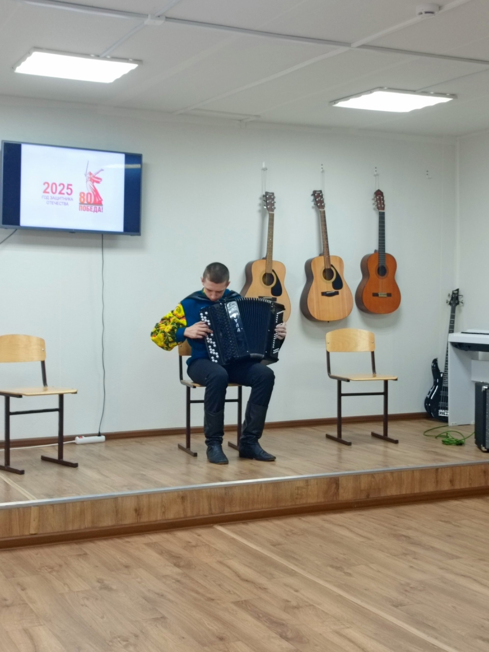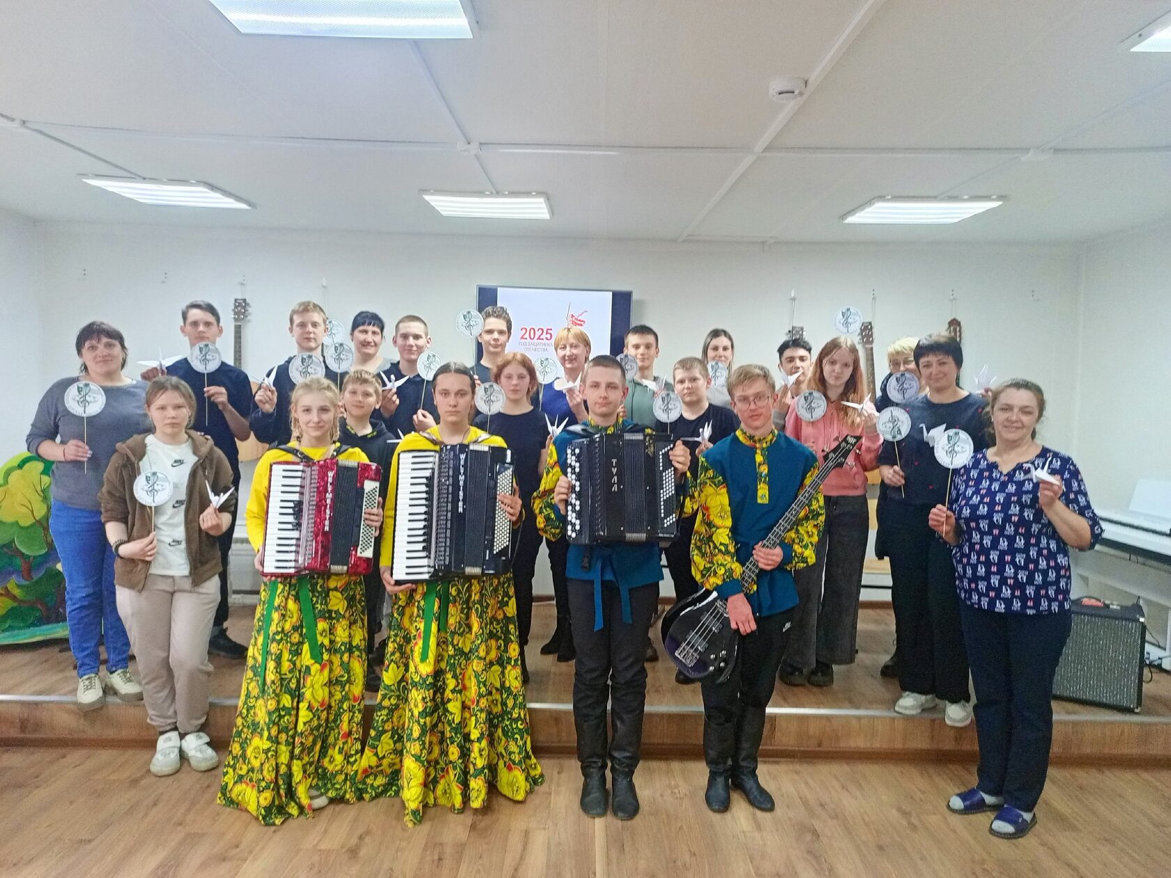 Выпускники предпрофессиональной программы "Народные инструменты" Рыжиков Никитина, Быкова Кристина, Любиншина Алиса, а также выпускник программы "Три аккорда" Демидов Иван исполнили четырнадцать произведений русских и зарубежных композиторов. Зал очень тепло принял наших музыкантов, а в финале сделали общую фотографию с символами победы-белыми журавлями и эмблемой школы. Благодарим ребят за работу, зрителей за внимание, а преподавателей за подготовку.
